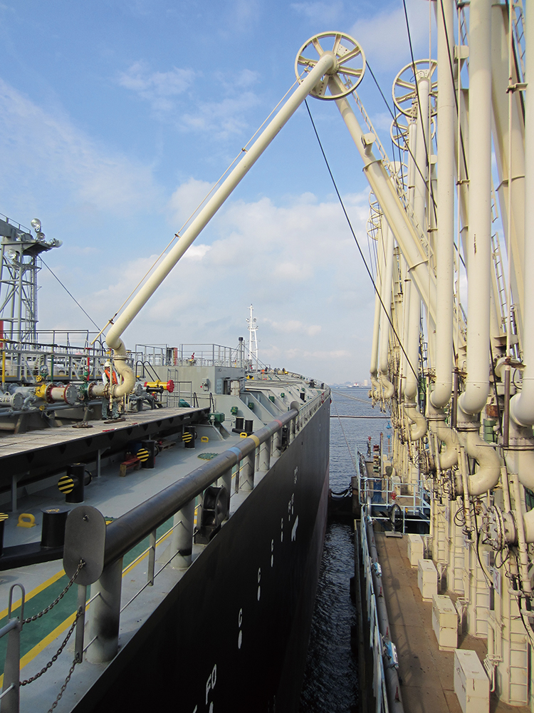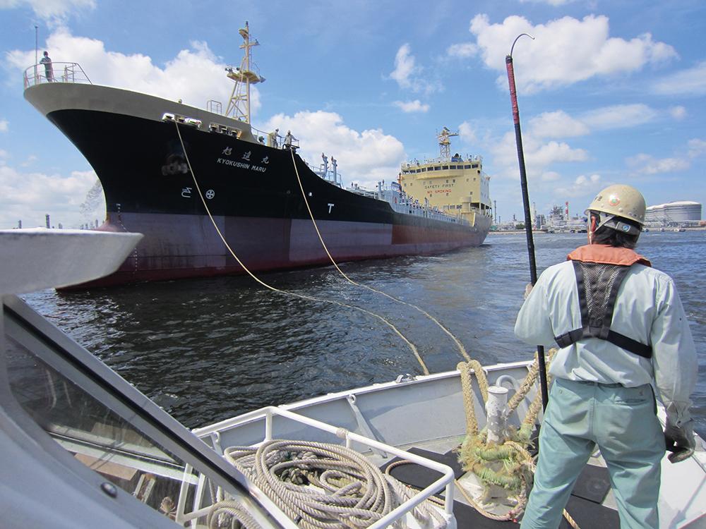 石油メーカーにおいて、小型船を使用した綱取り作業(船舶の係留索〔もやい〕を岸壁のビットに設置)によってタンカーを岸壁に接岸する他、外航タンカーのマニホールドにローディングアームを接続して、タンカーと岸壁のステーション間の石油移送作業を行っています。